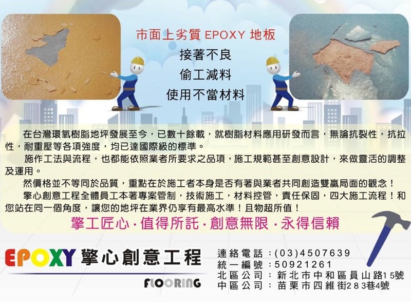 在台灣環氧樹脂地坪發展至今,已數十餘載,就樹脂材料應用研發而言,無論抗裂性,抗拉性,耐重壓等各項強度,均已達國際級的標準。 施作工法與流程,也都能依照業者所要求之品項,施工規範甚至創意設計,來做靈活的...(詳細內容)