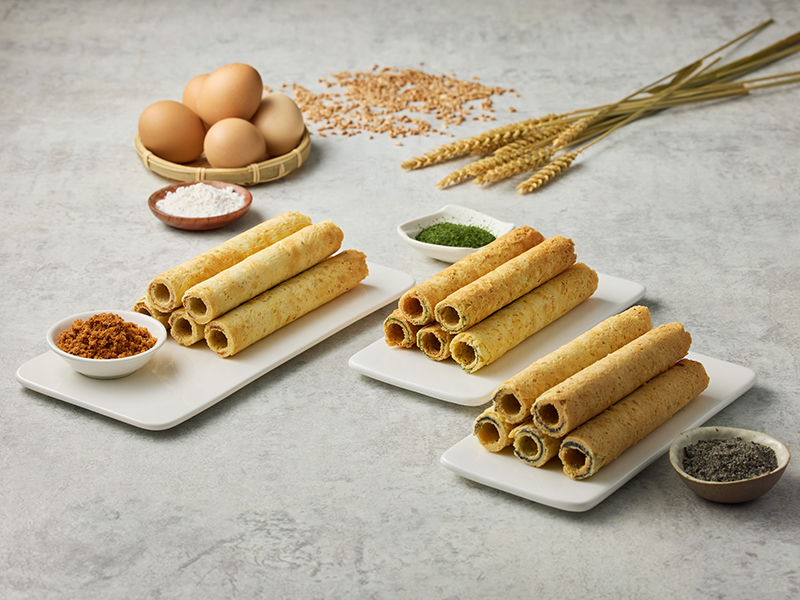 夾心蛋捲的口感特殊,在花博期間,有朋友笑說我們的蛋捲是用舌頭吃的蛋捲,扎實綿密,卻入口即化,加上有旗魚酥、黑糖花生、黑芝麻、杏仁、海藻等多種口味的選擇,更呈現出不同層次的口感。為了更營養更健康特別採低糖、低油脂的方式來製作蛋捲,精選紐西蘭進口的無水奶油(成本貴了5倍),使蛋捲吃起來完全不油膩,也不會太甜,兩捲一盒的真空包裝,當下午茶、點心剛剛好,既能補充營養又能吃到健康。