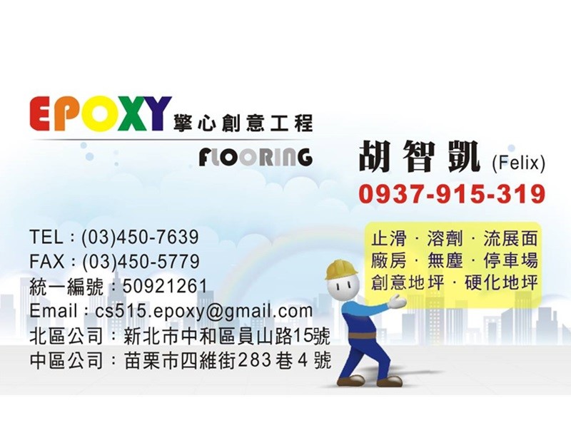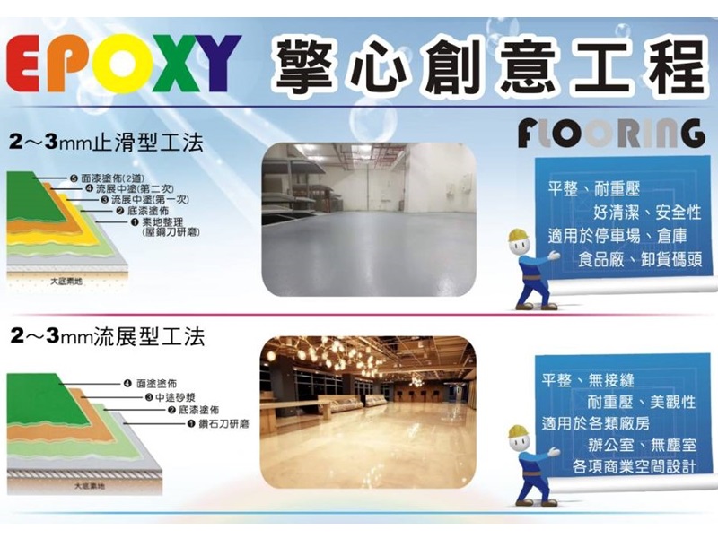在台灣環氧樹脂地坪發展至今,已數十餘載,就樹脂材料應用研發而言,無論抗裂性,抗拉性,耐重壓等各項強度,均已達國際級的標準。 施作工法與流程,也都能依照業者所要求之品項,施工規範甚至創意設計,來做靈活的調整及運用。 然價格並不等同於品質,重點在於施工者本身是否有著與業者共同創造雙贏局面的觀念! 擎心創意工程全體員工本著 專案管制,技術施工,材料控管,責任保固,四大施工流程!和您站在同一個角度,讓您的地坪在業界仍享有最高水準!且物超所值!
