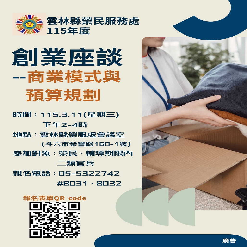 想了解如何尋找商業模式創造價值最大化創業資金哪裡來?怎麼配置?雲林縣榮服處告訴您歡迎退除役官兵報名參加創業座談~主題:商業模式與預算規劃時間:115.03.11(星期三)下午2-4時地點:雲林縣榮服處會議室(斗六市榮譽路160-1號)參加對象:榮民、輔導期限內二類官兵線上報名網址:https://forms.gle/eEJJCftrEcgqE4NaA報名電話:05-5322742分機8028、8032