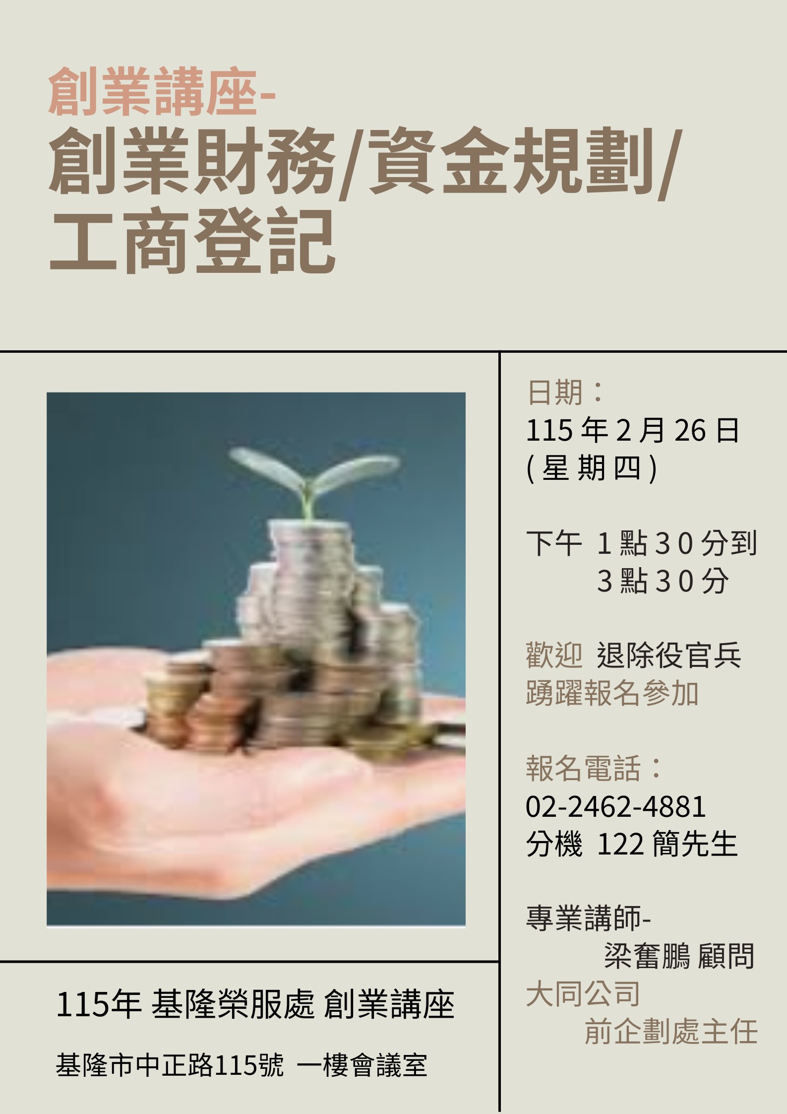 基隆市榮服處辦理「創業財務/資金規劃/工商登記」 講座